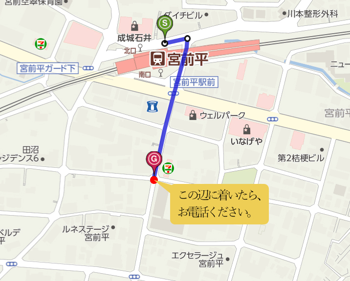 東急田園都市線 宮前平駅に着いたら、お電話ください。